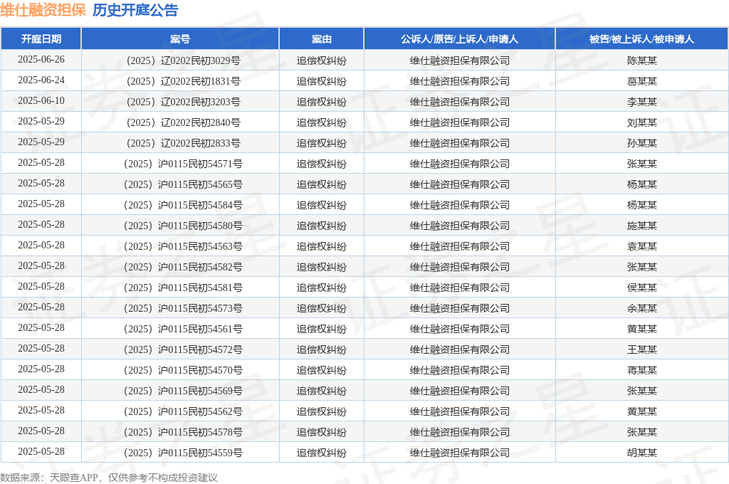 本站消息,根据天眼查APP显示,近日公布了一则维仕融资担保有限公司作为原告/上诉人的开庭公告,详细内容如下: